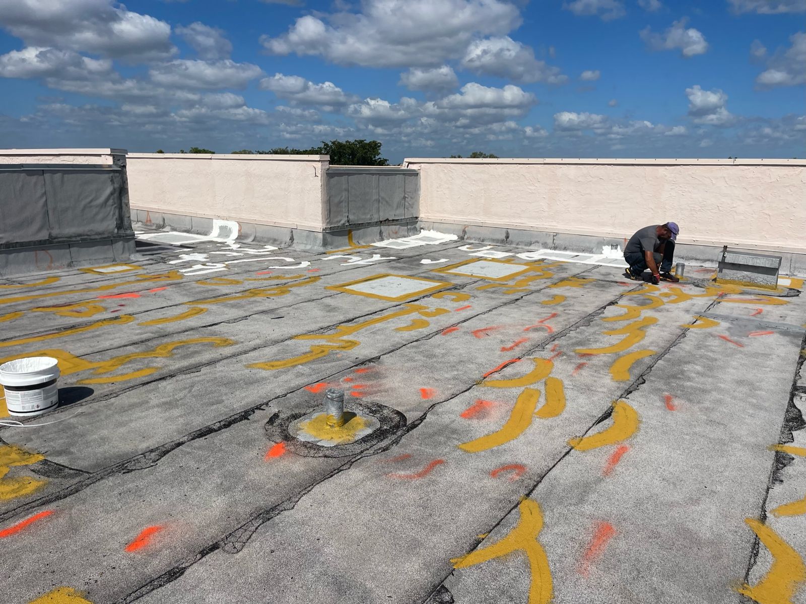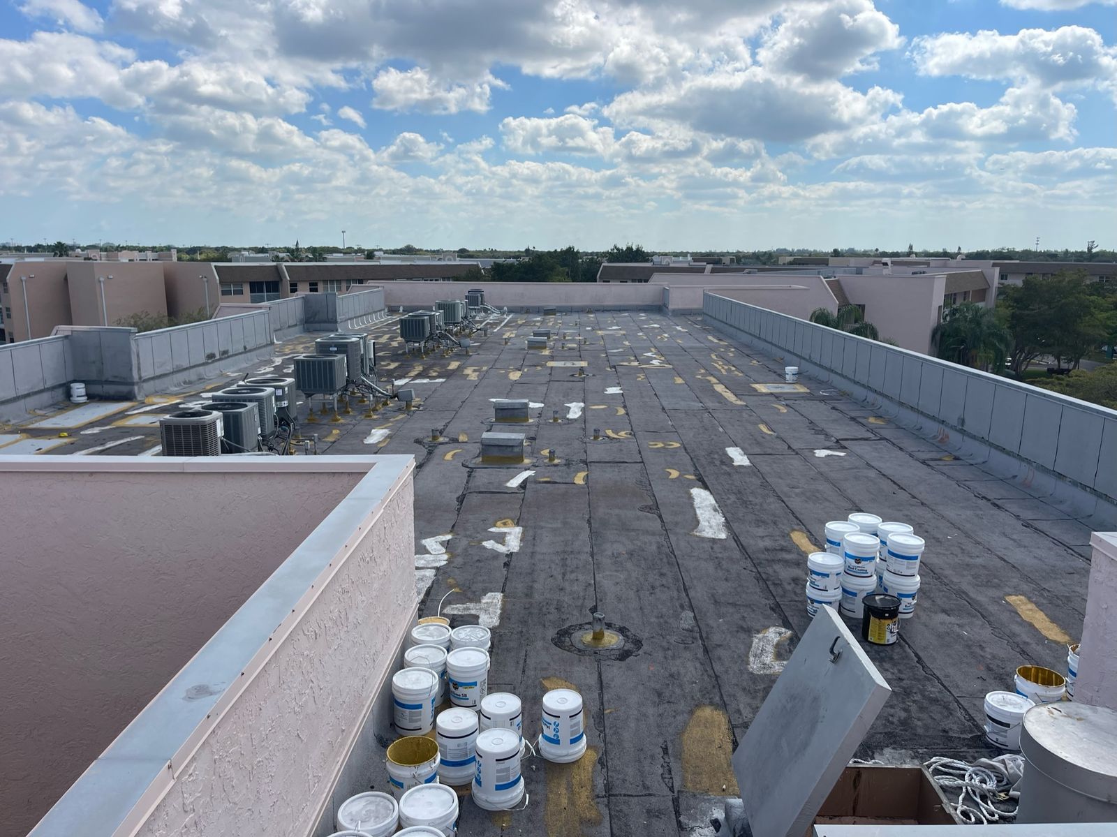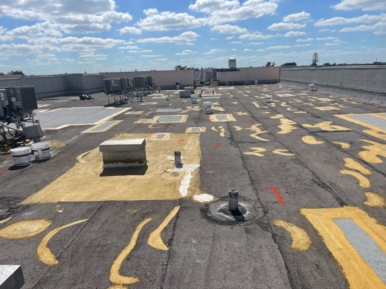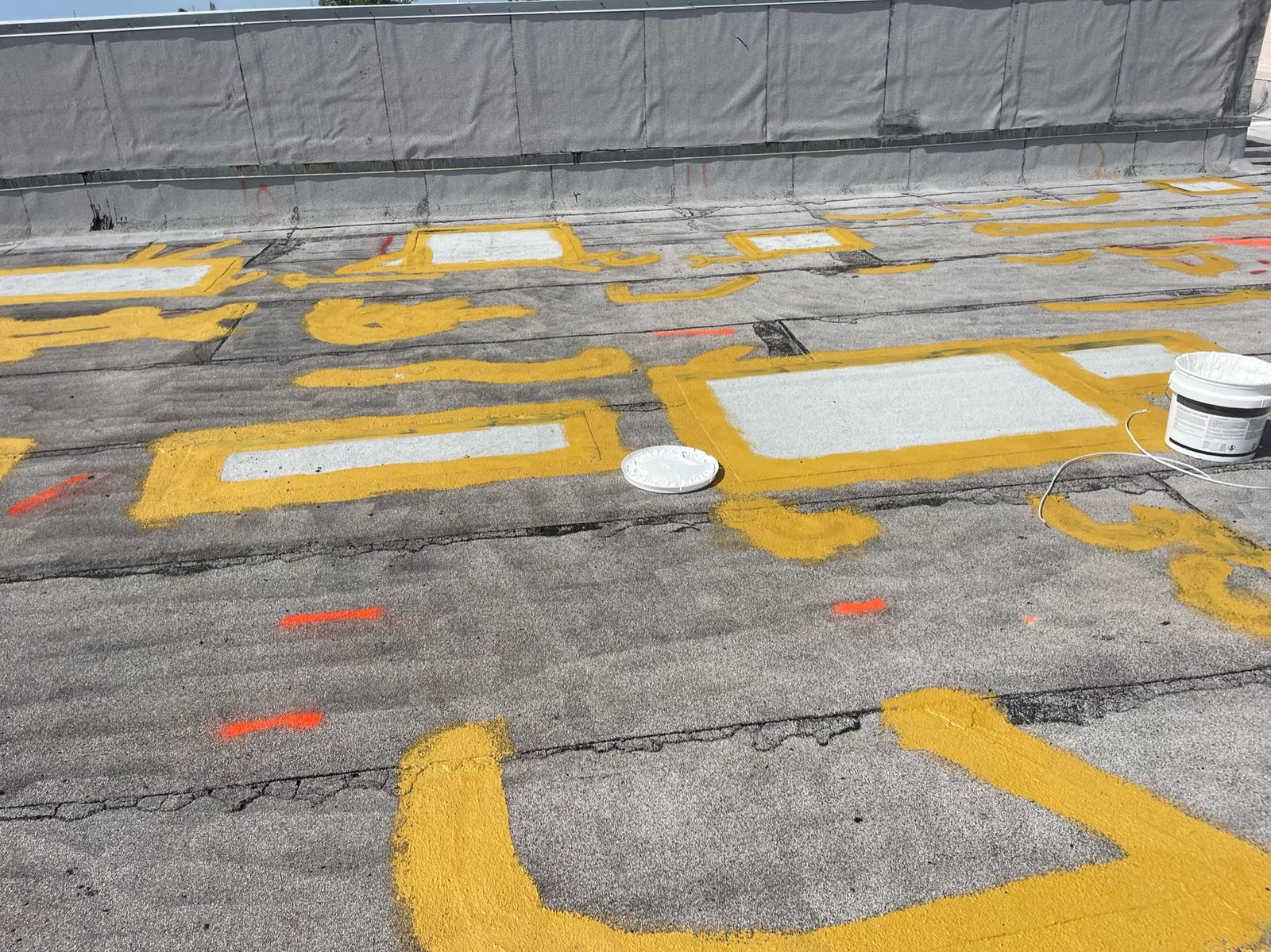 The project began with a comprehensive moisture survey and adhesion (bonding) testing to verify substrate conditions and system compatibility. Once confirmed, the roof surface was thoroughly cleaned and prepared to ensure proper adhesion of all restoration materials.