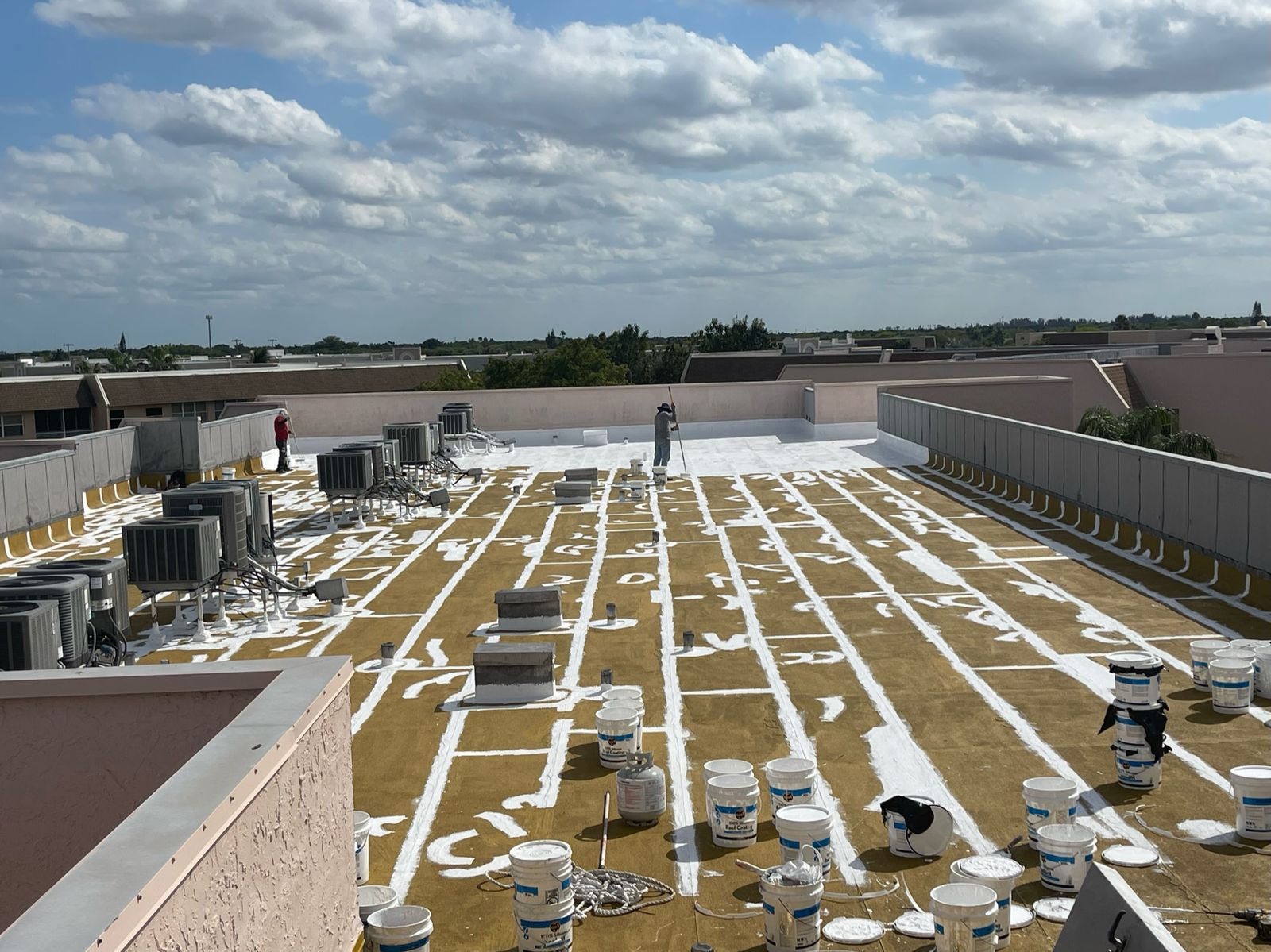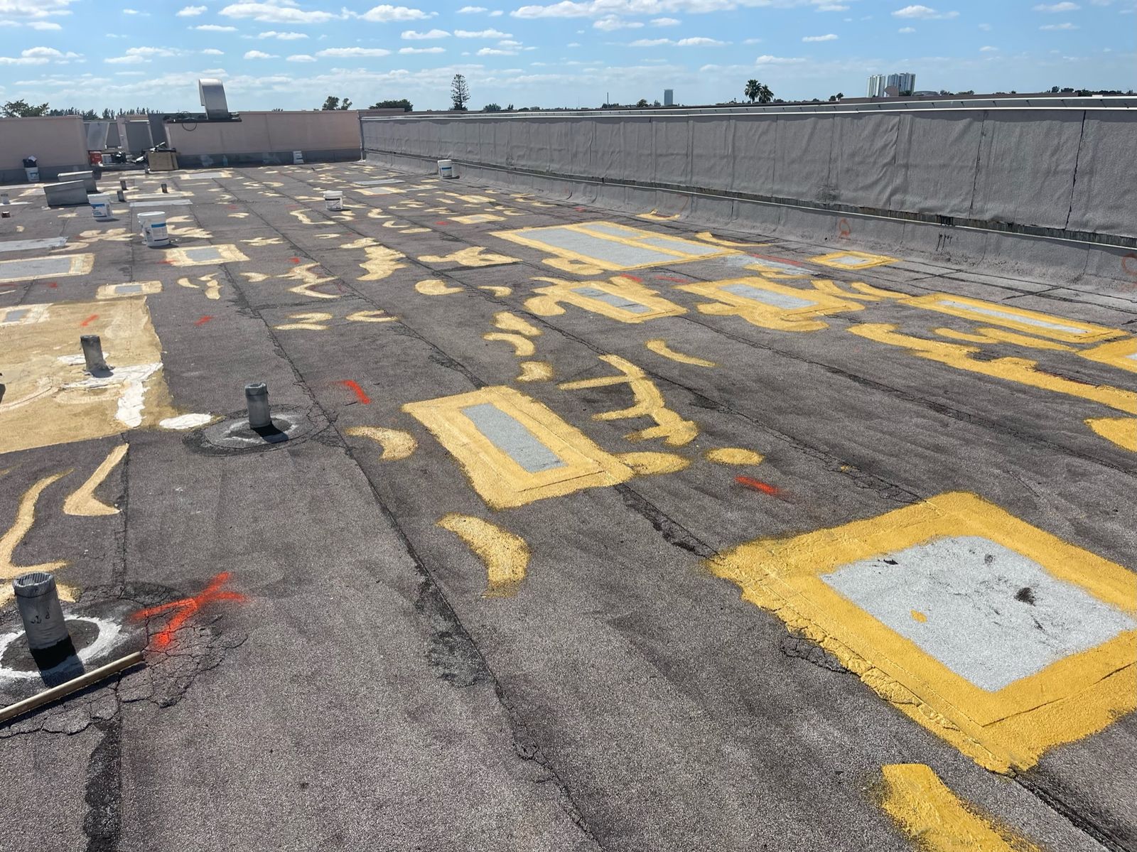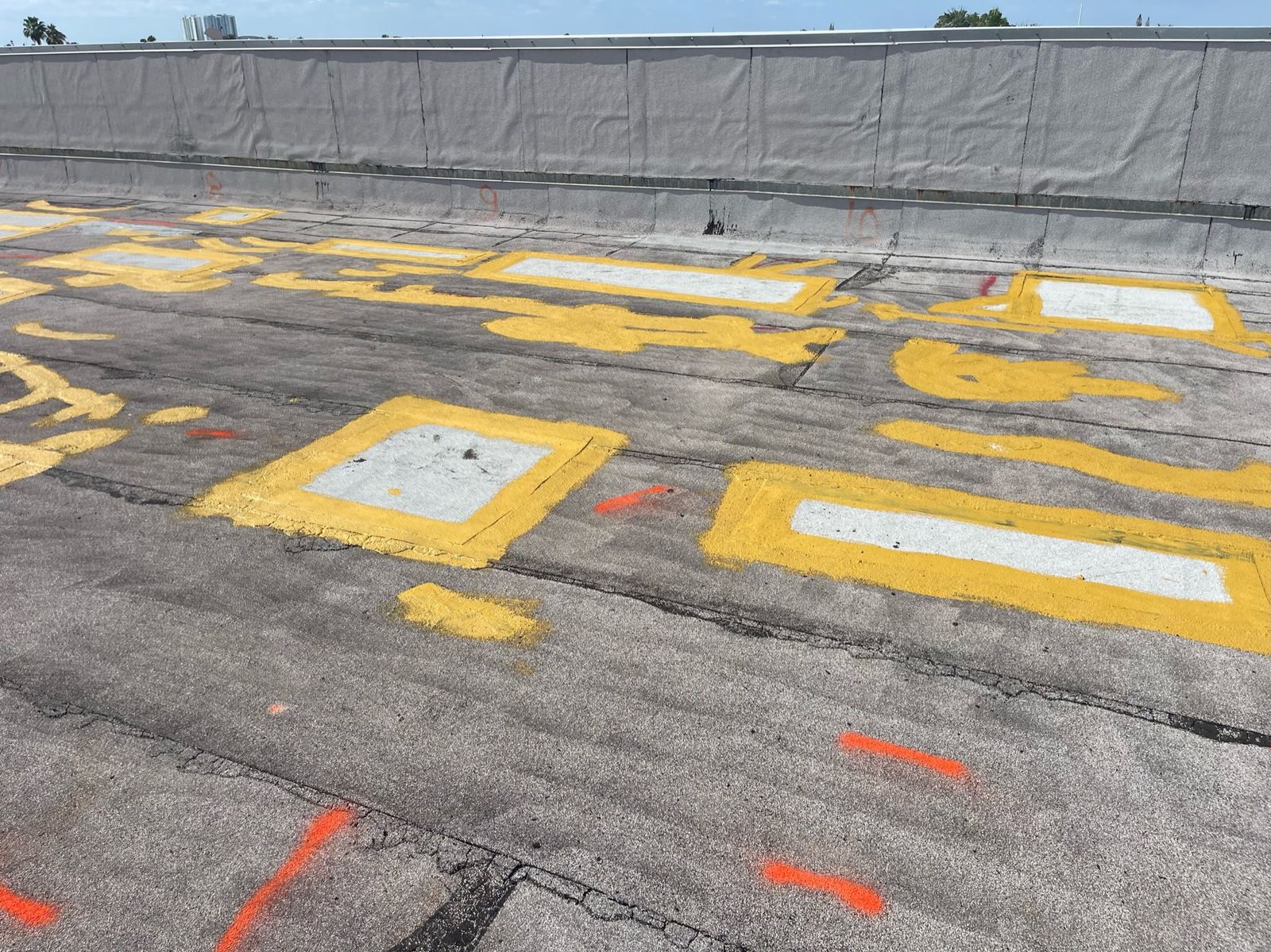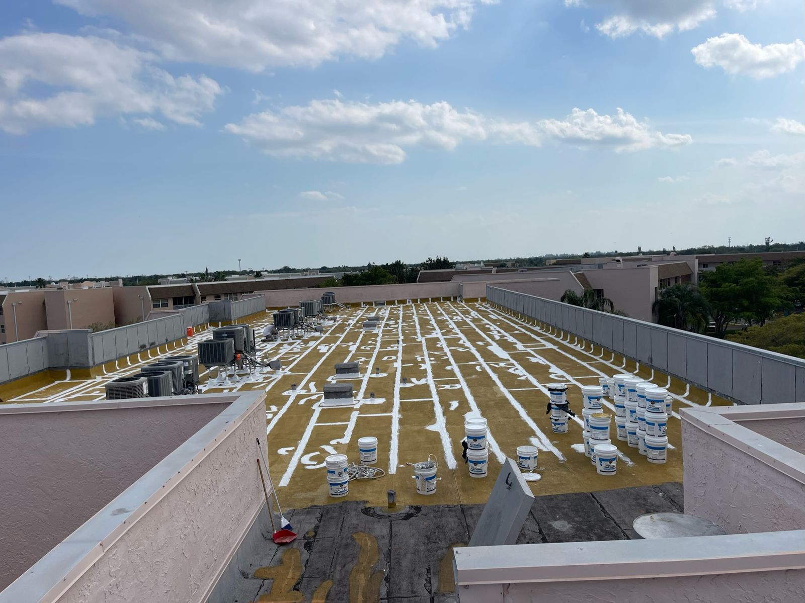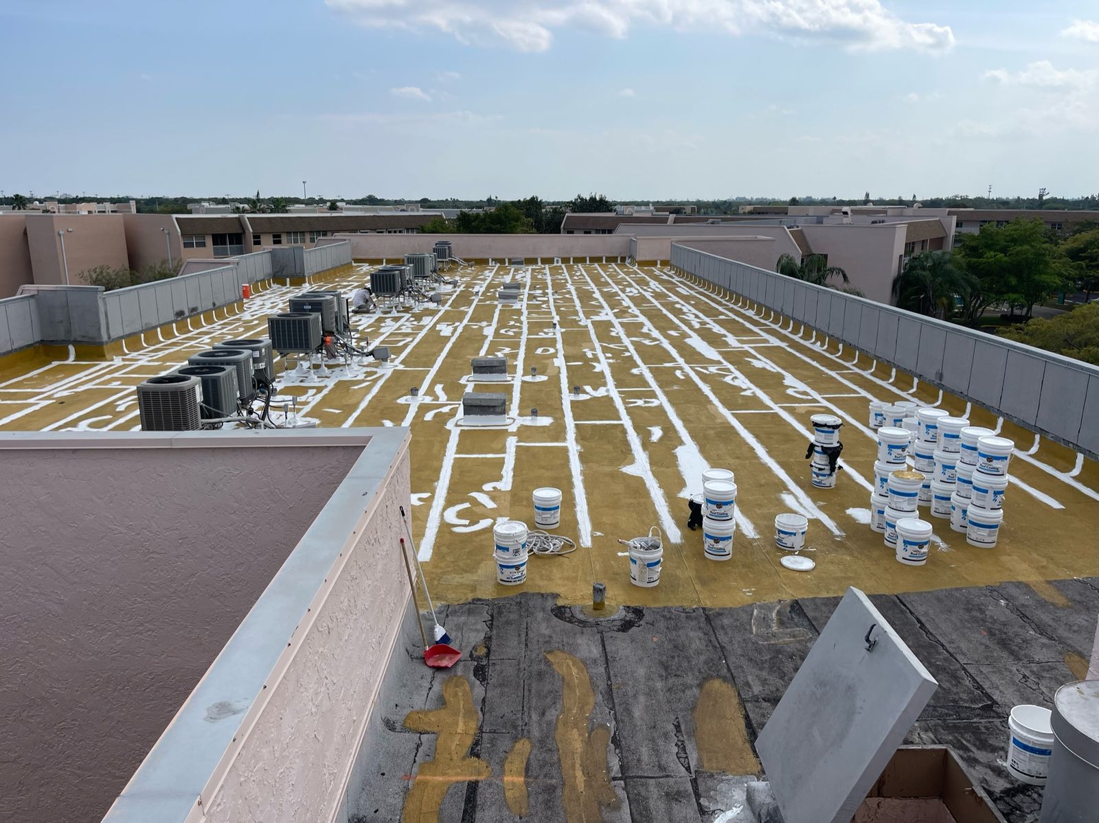 The project began with a comprehensive moisture survey and adhesion (bonding) testing to verify substrate conditions and system compatibility. Once confirmed, the roof surface was thoroughly cleaned and prepared to ensure proper adhesion of all restoration materials.
